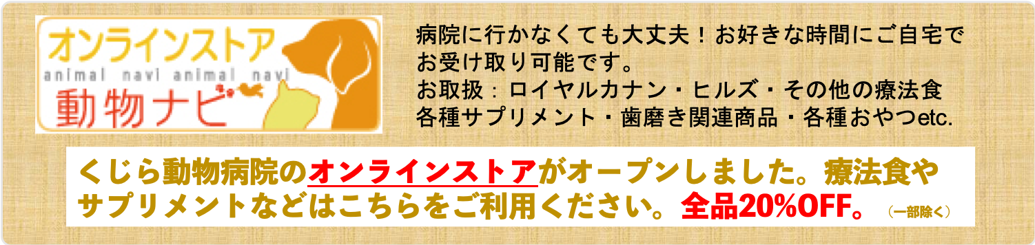 くじら動物病院のオンラインストアを開設いたしました。お薬以外のほとんどの製品をお取り扱いしておりますので、是非ご利用ください。病院IDを病院にあるパンフレットから入力いただくか、かかりつけ病院をくじら動物病院で登録いただくとご利用可能となります。登録してすぐにご利用可能です。全品20%OFFとなっております。(一部商品を除く。割引は変更となる場合があります。)