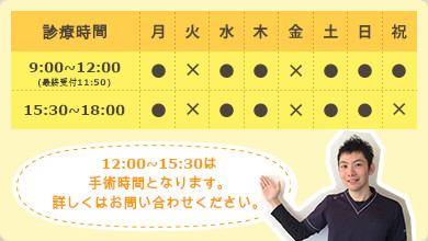 | 午後 | 診察 | 休診 | 休診 | 休診 | 休診 | 休診 | 休診 | 診察 |